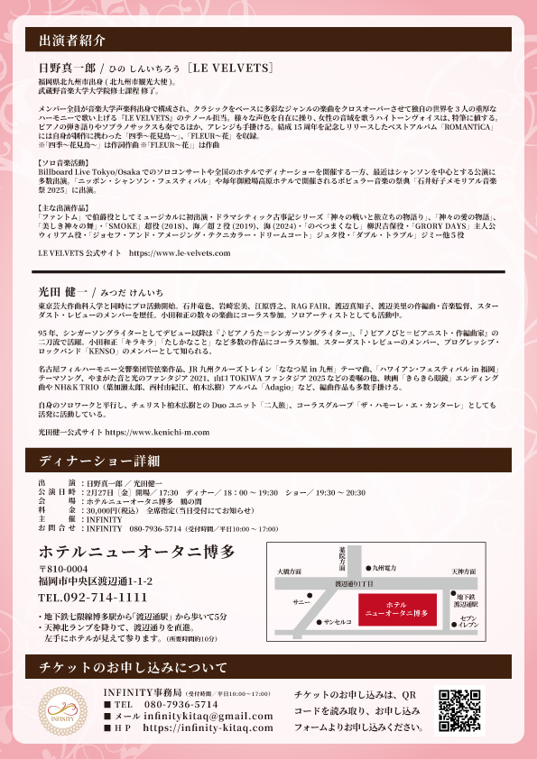 北九州地域に存在する、又は北九州出身の優れた才能を持つ人財を活用し、市民が喜び、学べる事業展開をすると同時に、北九州以外の人々にも北九州の素晴らしさを認識してもらえるような活動展開をするために、無限の可能性を持つ団体「INFINITY」と申します。